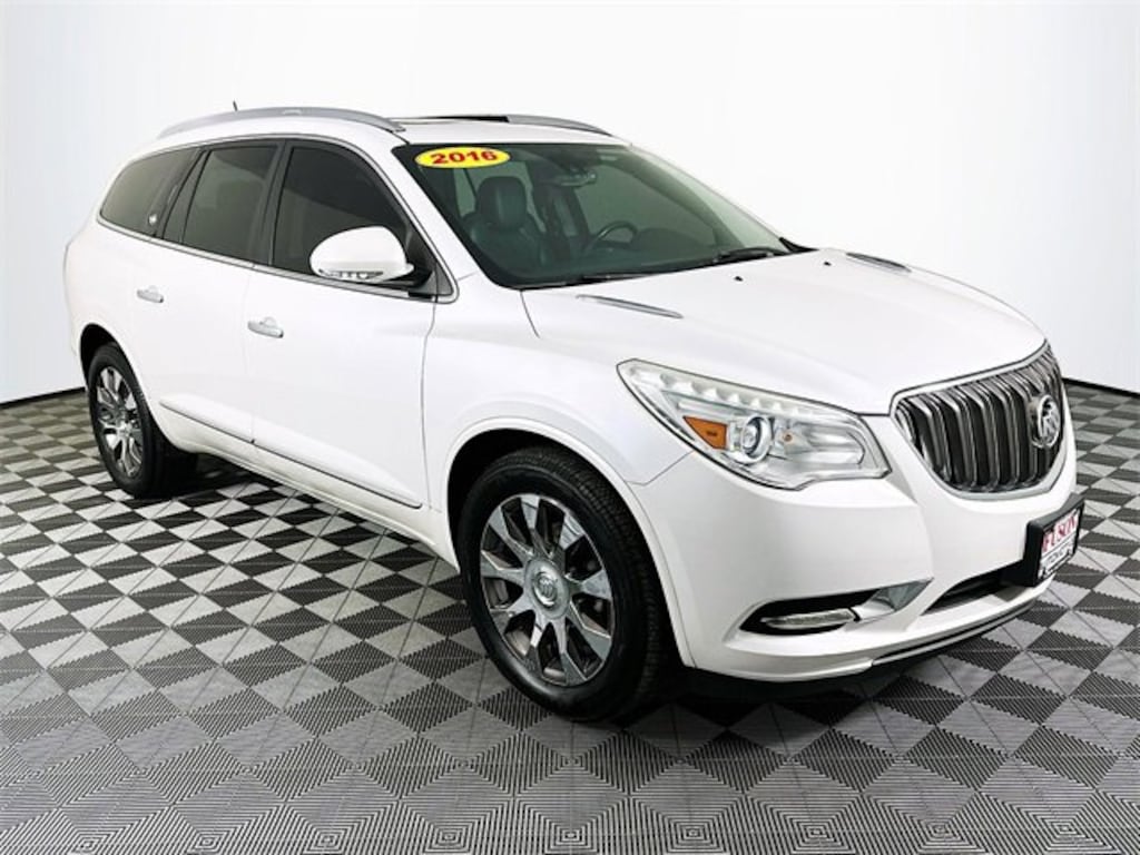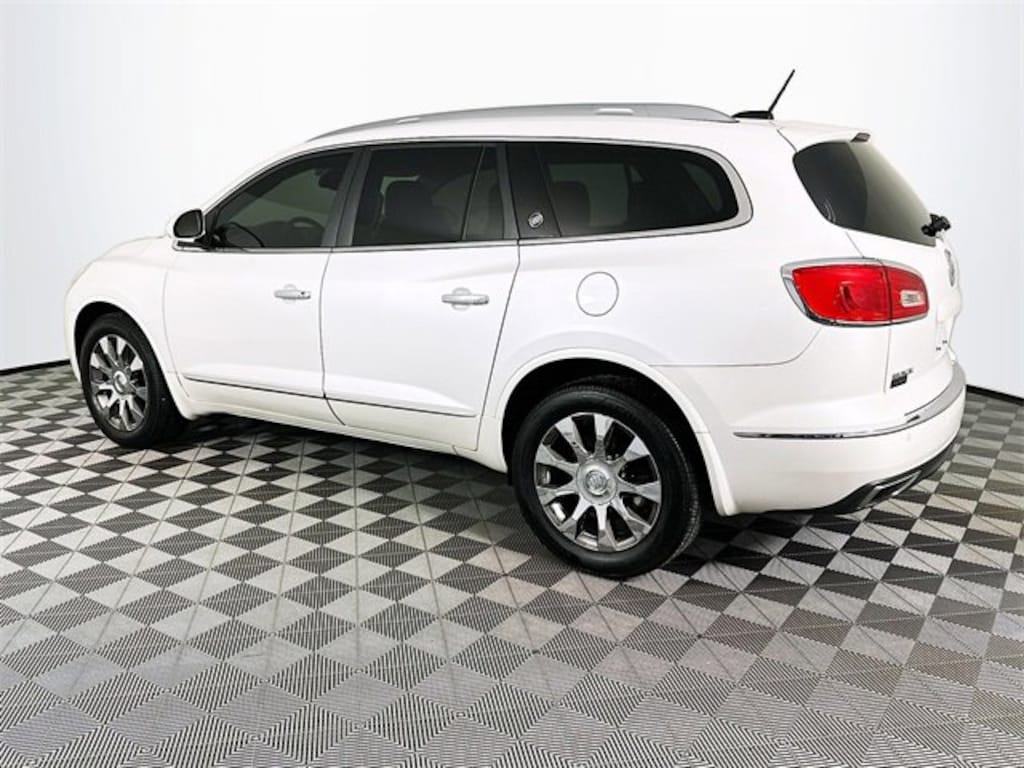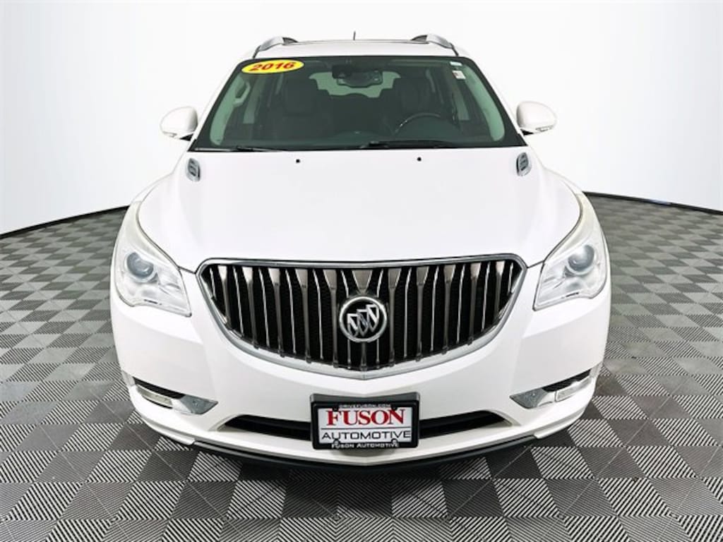 Buick Interior Protection Package (LPO) (3rd Row All-Weather Floor Mats, All-Weather Cargo Mat (LPO), and All-Weather Floor Mats), Enclave Tuscan Edition (Bronze-Toned Grille and Wheels: 20 Chrome-Clad Cast Aluminum w/Bronze Pockets), Preferred Equipment Group 1SN (Bose Sound System, Forward Collision Alert & Lane Departure Warning, and NavTraffic), Premium Package (Articulating Headlights, Heated & Cooled Driver & Front Passenger Seats, Power Tilt & Telescopic Steering Column, and Power-Folding Heated Body-Color Outside Mirrors), AWD, 10 Speakers, 120-Volt 3-Prong Household-Style Power Outlet, 3.16 Axle Ratio, 3rd row seats: split-bench, 4-Wheel Disc Brakes, 7-Passenger Seating, ABS brakes, Air Conditioning, Alloy wheels, AM/FM radio: SiriusXM, Auto tilt-away steering wheel, Auto-dimming door mirrors, Auto-dimming Rear-View mirror, Automatic temperature control, Bose Advanced 10-Speaker Audio System, Bose Performance-Enhanced 10-Speaker System, Brake assist, Bumpers: body-color, CD player, Compass, Delay-off headlights, Driver door bin, Driver vanity mirror, Dual front impact airbags, Dual front side impact airbags, Electronic Stability Control, Emergency communication system: OnStar Guidance, Exterior Parking Camera Rear, Four wheel independent suspension, Front anti-roll bar, Front Bucket Seats, Front Center Armrest w/Storage, Front dual zone A/C, Front License Plate Mounting Bracket, Front reading lights, Fully automatic headlights, Garage door transmitter, Heated door mirrors, Heated front seats, Heated steering wheel, High intensity discharge headlights: Bi-Xenon, Illuminated entry, Leather steering wheel, Low tire pressure warning, Memory seat, Navigation System, Occupant sensing airbag, Outside temperature display, Overhead airbag, Panic alarm, Passenger door bin, Passenger vanity mirror, Perforated Leather-Appointed Seat Trim, Power door mirrors, Power driver seat, Power Liftgate, Power passenger seat, Power steering, Power Tilt-Sliding Moonroof, Power windows, Radio data system, Radio: Color Touch AM/FM/CD/DVD/Nav w/IntelliLink, Radio: Color Touch AM/FM/CD/Nav w/IntelliLink, Rear air conditioning, Rear anti-roll bar, Rear audio controls, Rear Audio System Controls, Rear Parking Sensors, Rear reading lights, Rear Seat Entertainment System, Rear window defroster, Rear window wiper, Remote keyless entry, Roof rack: rails only, Security system, Speed control, Speed-sensing steering, Spoiler, Steering wheel memory, Steering wheel mounted audio controls, Tachometer, Telescoping steering wheel, Tilt steering wheel, Traction control, Trip computer, Turn signal indicator mirrors, Variably intermittent wipers, Ventilated front seats, Voltmeter, and Wheels: 19 Chrome-Clad Cast Aluminum. Clean CARFAX. Recent Arrival! White Frost Tricoat Buick 2016 Enclave Premium Group