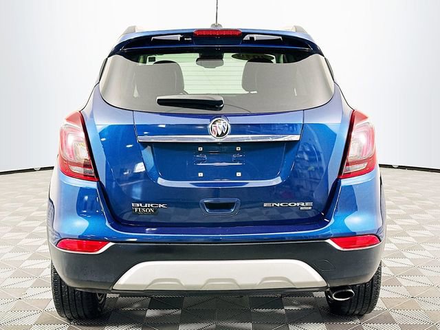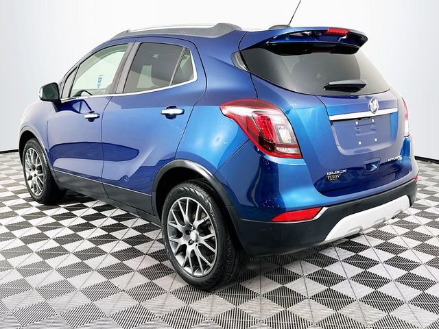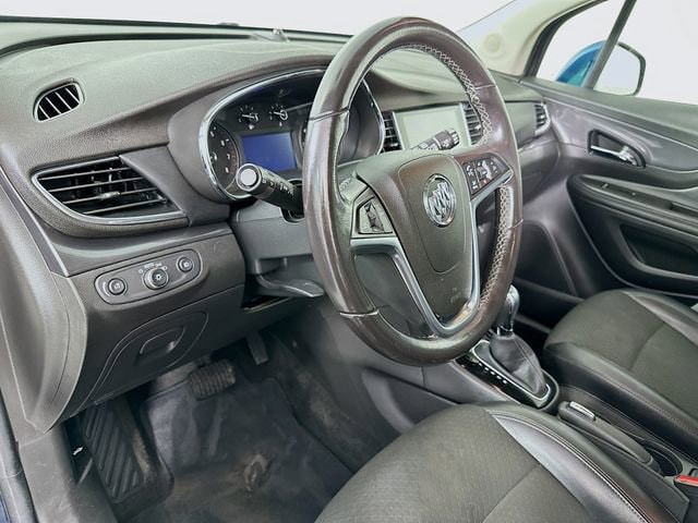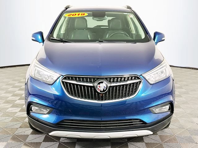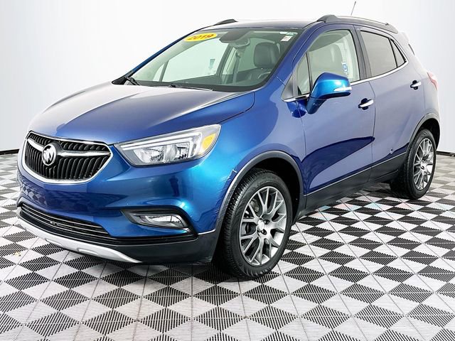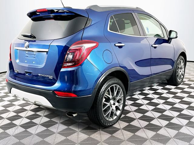 Encore Sport Touring Package (Rear Sport Spoiler), Preferred Equipment Group 1SH (Front Fog Lamps and Remote Vehicle Starter System), Safety Package (120-Volt Power Outlet, Rear Cross Traffic Alert, and Side Blind Zone Alert), 2-Way Manual Front Passenger Seat Adjuster, 3.53 Final Drive Axle Ratio, 4-Wheel Disc Brakes, 6 Speakers, 6-Speaker Audio System, 6-Way Power Driver Seat Adjuster, ABS brakes, Air Conditioning, Alloy wheels, AM/FM radio: SiriusXM, Apple CarPlay/Android Auto, Auto-Dimming Inside Rear-View Mirror, Brake assist, Bumpers: body-color, Cloth w/Leatherette Seat Trim, Compass, Delay-off headlights, Driver door bin, Driver vanity mirror, Driver's Seat Mounted Armrest, Dual front impact airbags, Dual front side impact airbags, Dual-Zone Automatic Climate Control, Electronic Stability Control, Emergency communication system: OnStar and Buick connected services capable, Exterior Parking Camera Rear, Front anti-roll bar, Front Bucket Seats, Front fog lights, Front License Plate Bracket, Front reading lights, Front wheel independent suspension, Fully automatic headlights, Heated door mirrors, Illuminated entry, Inside Rearview Manual Day/Night Mirror w/Tilt, Knee airbag, Low tire pressure warning, Occupant sensing airbag, Outside temperature display, Overhead airbag, Panic alarm, Passenger door bin, Passenger vanity mirror, Power door mirrors, Power driver seat, Power steering, Power Tilt-Sliding Moonroof, Power windows, Radio data system, Radio: Buick Infotainment System AM/FM Stereo, Radio: Buick Infotainment System AM/FM w/Nav, Rear seat center armrest, Rear side impact airbag, Rear window defroster, Rear window wiper, Remote keyless entry, Ride & Handling Suspension, Roof rack: rails only, Security system, SiriusXM Radio, Speed control, Speed-sensing steering, Split folding rear seat, Spoiler, Steering wheel mounted audio controls, Tachometer, Telescoping steering wheel, Tilt steering wheel, Traction control, Trip computer, Turn signal indicator mirrors, Variably intermittent wipers, and Wheels: 18 Midnight Silver Aluminum Alloy. CARFAX One-Owner. Deep Azure Metallic Buick 2019 Encore Sport Touring