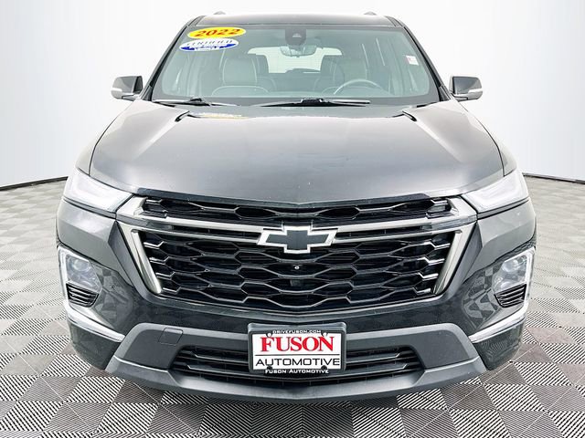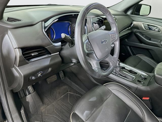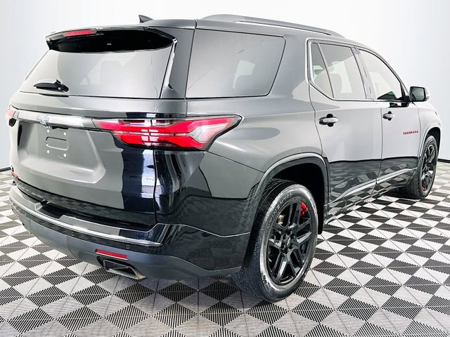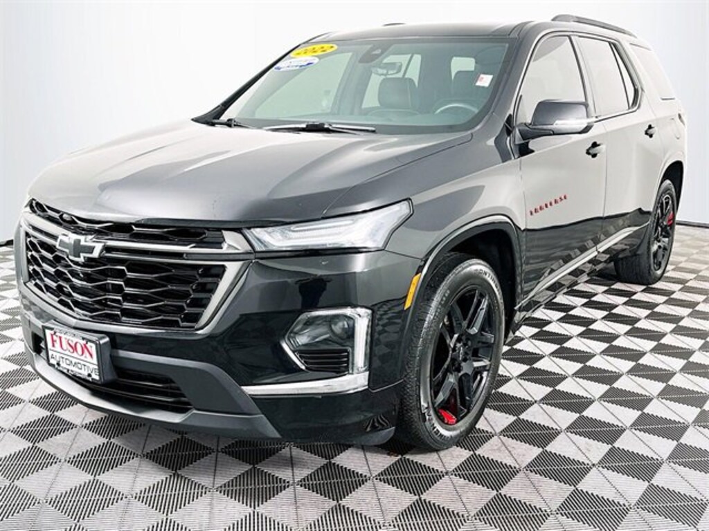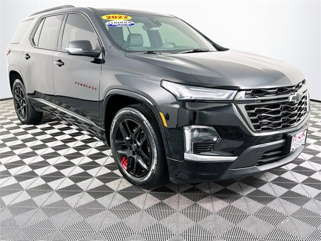 Floor Liner Package (LPO) (1st & 2nd Row All-Weather Floor Liner (LPO), 3rd Row All-Weather Floor Liner (LPO), and Integrated Cargo Liner (LPO)), Preferred Equipment Group 1LZ (Heated 2nd Row Outboard Position Seats, Heated Driver & Front Passenger Seats, Heated Steering Wheel, Rear Park Assist w/Audible Warning, and Ventilated Driver & Front Passenger Seats), Redline Edition (Black Door Handles, Black Roof Rails, Dual SkyScape 2-Panel Power Sunroof, Ornamentation, Redline Accent Decals (LPO), and Wheels: 20 Gloss Black Painted Alum w/Red Stripes), Trailering Equipment (Heavy-Duty Cooling System, Hitch Guidance w/Hitch View, and Trailering Assist Guidelines), 10 Speakers, 3.49 Axle Ratio, 3rd row seats: split-bench, 4-Wheel Disc Brakes, 6-Way Power Front Passenger Seat, 8-Way Power Driver Seat Adjuster, ABS brakes, Air Conditioning, Alloy wheels, AM/FM radio: SiriusXM with 360L, Apple CarPlay/Android Auto, Auto High-beam Headlights, Auto-dimming door mirrors, Auto-dimming Rear-View mirror, Automatic temperature control, Black Lug Nut & Wheel Lock Kit (LPO), Bose Premium 10-Speaker Audio System Feature, Brake assist, Bumpers: body-color, Compass, Delay-off headlights, Driver door bin, Driver vanity mirror, Dual front impact airbags, Dual front side impact airbags, Electronic Stability Control, Emergency communication system: OnStar Guidance, Four wheel independent suspension, Front anti-roll bar, Front Bucket Seats, Front Center Armrest, Front dual zone A/C, Front Passenger 2-Way Power Lumbar, Front reading lights, Fully automatic headlights, Garage door transmitter, Heated door mirrors, Heated front seats, Heated rear seats, Heated steering wheel, Illuminated entry, Leather steering wheel, Low tire pressure warning, Memory seat, Navigation System, Not Equipped w/Dr & Fr Pass Heated or Ventilated Seats, Not Equipped w/Heated Rear Outboard Seats (DISC), Not Equipped w/Heated Steering Wheel, Not Equipped w/Rear Park Assist, Occupant sensing airbag, Outside temperature display, Overhead airbag, Overhead console, Panic alarm, Passenger door bin, Passenger vanity mirror, Perforated Leather-Appointed Seat Trim, Power door mirrors, Power Driver Lumbar Control, Power driver seat, Power Liftgate, Power passenger seat, Power steering, Power windows, Premium audio system: Chevrolet Infotainment 3 Plus, Radio data system, Radio: Chevrolet Infotainment 3 Plus System w/Navi, Rear air conditioning, Rear anti-roll bar, Rear reading lights, Rear window defroster, Rear window wiper, Remote keyless entry, Roof rack: rails only, Security system, SiriusXM w/360L, Speed control, Speed-sensing steering, Spoiler, Steering wheel memory, Steering wheel mounted audio controls, Tachometer, Telescoping steering wheel, Tilt steering wheel, Traction control, Trip computer, Turn signal indicator mirrors, Variably intermittent wipers, Ventilated front seats, Voltmeter, and Wheels: 20 Metallic Machined-Face Aluminum. Clean CARFAX. CARFAX One-Owner. Mosaic Black Metallic Chevrolet 2022 Traverse Premier