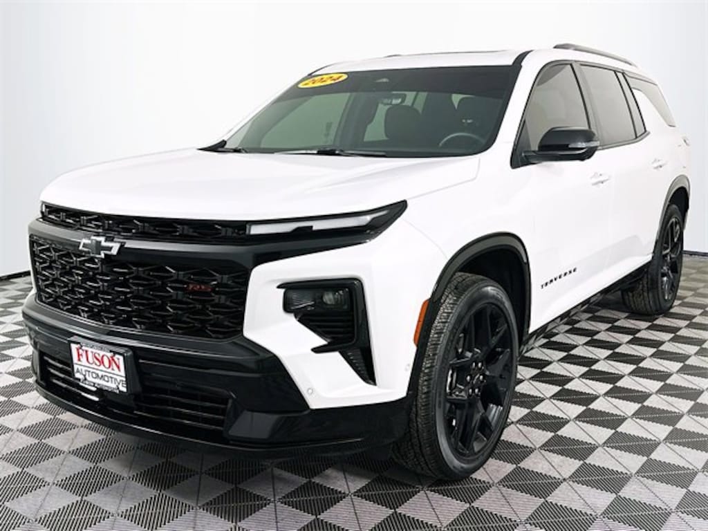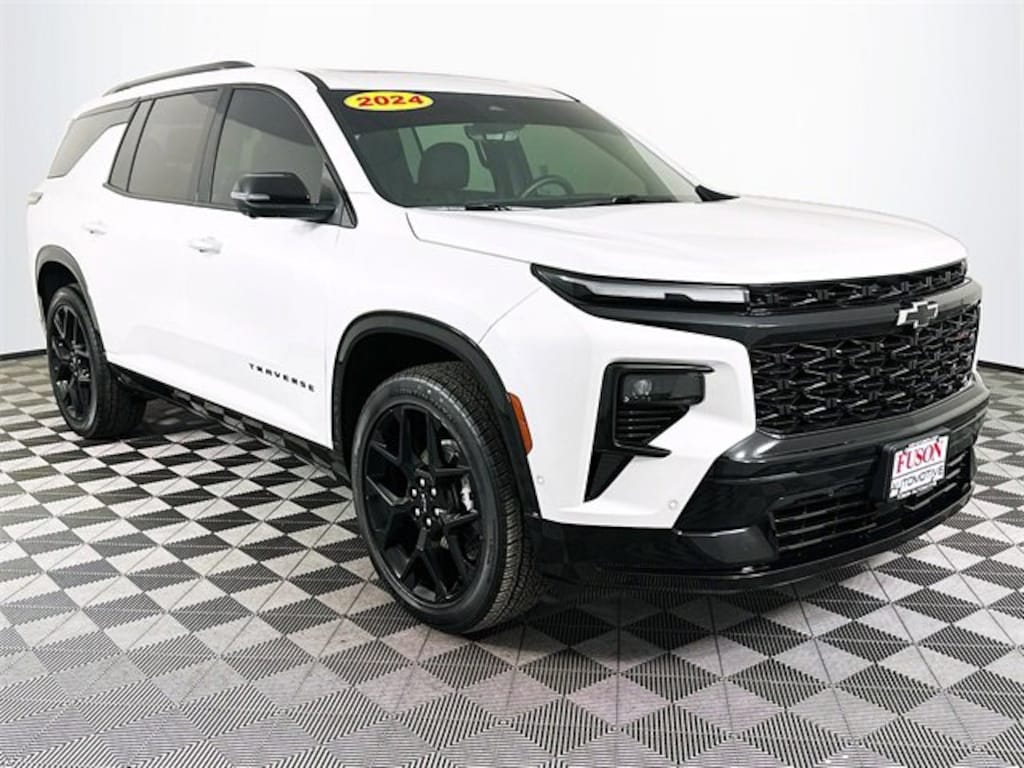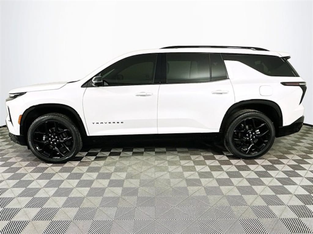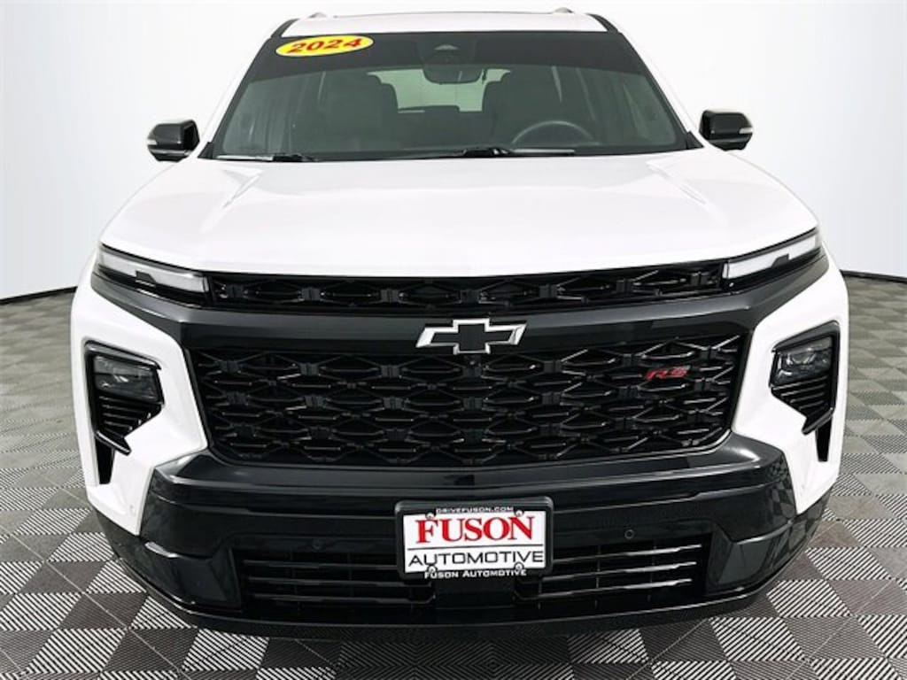 Preferred Equipment Group 1RS, 10 Speakers, 3rd row seats: split-bench, 4-Wheel Disc Brakes, 6-Way Power Front Passenger Seat Adjuster, 8-Way Power Driver Seat Adjuster, ABS brakes, Air Conditioning, Alloy wheels, AM/FM radio: SiriusXM with 360L, Apple CarPlay/Android Auto, Auto High-beam Headlights, Auto-dimming door mirrors, Automatic temperature control, Bose Premium 10-Speaker Audio System Feature, Brake assist, Bumpers: body-color, Compass, Delay-off headlights, Driver 4-Way Power Lumbar Seat Adjuster, Driver door bin, Driver vanity mirror, Dual front impact airbags, Dual front side impact airbags, Electronic Stability Control, Emergency communication system, Exterior Parking Camera Rear, Four wheel independent suspension, Front anti-roll bar, Front Bucket Seats, Front Center Armrest, Front dual zone A/C, Front Passenger 4-Way Power Lumbar Seat Adjuster, Front reading lights, Fully automatic headlights, Heated door mirrors, Heated front seats, Heated rear seats, Heated steering wheel, Illuminated entry, Low tire pressure warning, Navigation System, Not Equipped w/Heated Wiper Park, Occupant sensing airbag, Outside temperature display, Overhead airbag, Overhead console, Panic alarm, Passenger door bin, Passenger vanity mirror, Perforated Leather-Appointed Seat Trim, Power door mirrors, Power driver seat, Power Liftgate, Power moonroof, Power passenger seat, Power steering, Power windows, Radio data system, Radio: 17.7 Diagonal Display, Rain sensing wipers, Rear air conditioning, Rear anti-roll bar, Rear reading lights, Rear window defroster, Rear window wiper, Remote keyless entry, Security system, SiriusXM w/360L, Speed control, Speed-sensing steering, Spoiler, Sport steering wheel, Steering wheel mounted audio controls, Tachometer, TBD Axle Ratio, Telescoping steering wheel, Tilt steering wheel, Traction control, Trip computer, Turn signal indicator mirrors, Variably intermittent wipers, Ventilated front seats, Voltmeter, and Wheels: 22 High Gloss Black Painted Aluminum. Clean CARFAX. CARFAX One-Owner. Iridescent Pearl Tricoat Chevrolet 2024 Traverse RS