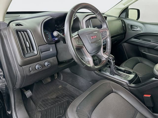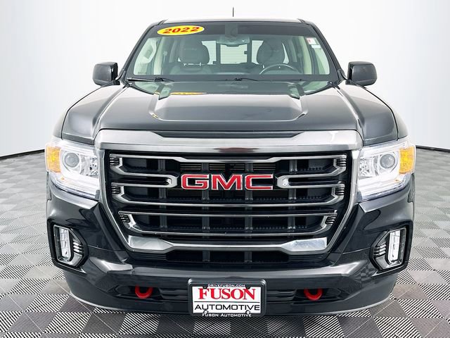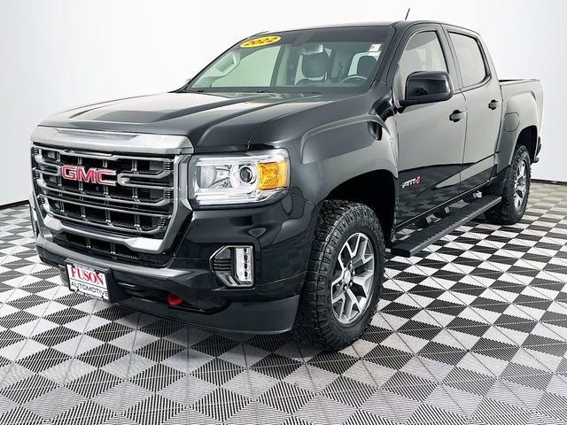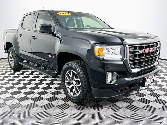 Preferred Equipment Group 4SB (Hitch Guidance and Tow/Haul Mode), Trailering Package, 4WD, 3 Years of OnStar & Connected Services Plan (DISC), 3.42 Rear Axle Ratio, 4-Wheel Disc Brakes, 6 Speakers, 6-Speaker Audio System Feature, ABS brakes, Air Conditioning, Alloy wheels, AM/FM radio: SiriusXM, Apple CarPlay/Android Auto, Auto-dimming Rear-View mirror, Automatic temperature control, Bumpers: body-color, Cloth Seat Trim, Compass, Delay-off headlights, Driver 6-Way Power Seat Adjuster, Driver door bin, Driver Instrument Information Enhanced Display, Driver vanity mirror, Dual front impact airbags, Dual front side impact airbags, Electronic Stability Control, Emergency communication system: OnStar and GMC Connected Services capable, Exterior Parking Camera Rear, Front anti-roll bar, Front Bucket Seats, Front Center Armrest, Front fog lights, Front License Plate Kit, Front reading lights, Front wheel independent suspension, Fully automatic headlights, HD Radio, Heated door mirrors, Heated Steering Wheel, Illuminated entry, Low tire pressure warning, Not Equipped w/Hood Insulator (DISC), Occupant sensing airbag, Outside temperature display, Overhead airbag, Overhead console, Panic alarm, Passenger door bin, Passenger vanity mirror, Power door mirrors, Power Driver Lumbar Control Seat Adjuster, Power driver seat, Power steering, Power windows, Premium audio system: GMC Infotainment System, Radio data system, Radio: AM/FM w/8 Diagonal Color Touch-Screen, Rear reading lights, Rear seat center armrest, Rear step bumper, Rear window defroster, Remote keyless entry, Security system, SiriusXM Radio, Speed control, Speed-sensing steering, Steering wheel mounted audio controls, Tachometer, Telescoping steering wheel, Tilt steering wheel, Traction control, Trip computer, Variably intermittent wipers, and Wheels: 17 x 8 Dark Argent Metallic. Clean CARFAX. Onyx Black GMC 2022 Canyon AT4 w/Cloth