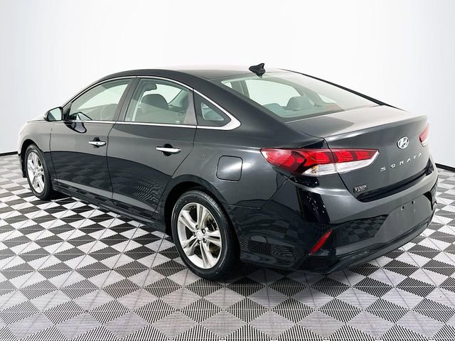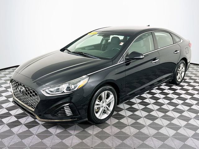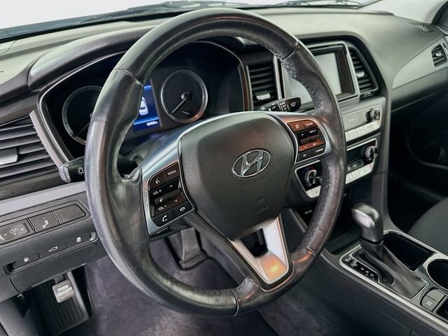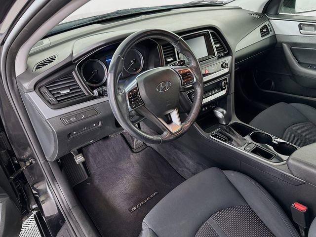Option Group 01, Black Cloth, 4-Wheel Disc Brakes, 6 Speakers, ABS brakes, Air Conditioning, Alloy wheels, AM/FM radio: SiriusXM, Apple CarPlay & Android Auto, Automatic temperature control, Brake assist, Bumpers: body-color, Cargo Net, Carpeted Floor Mats, Delay-off headlights, Driver door bin, Driver vanity mirror, Dual front impact airbags, Dual front side impact airbags, Electronic Stability Control, Emergency communication system: Blue Link, Exterior Parking Camera Rear, Four wheel independent suspension, Front anti-roll bar, Front Bucket Seats, Front Center Armrest, Front dual zone A/C, Front reading lights, Fully automatic headlights, Heated door mirrors, Heated Front Bucket Seats, Heated front seats, Heated steering wheel, Illuminated entry, Knee airbag, Leather Shift Knob, Leather steering wheel, Low tire pressure warning, Occupant sensing airbag, Outside temperature display, Overhead airbag, Overhead console, Panic alarm, Passenger door bin, Passenger vanity mirror, Power door mirrors, Power driver seat, Power steering, Power windows, Radio data system, Radio: AM/FM/HD/SiriusXM/MP3 Display Audio, Rear anti-roll bar, Rear Bumper Applique, Rear seat center armrest, Rear window defroster, Remote keyless entry, Reversible Cargo Tray, Security system, Speed control, Speed-sensing steering, Speed-Sensitive Wipers, Split folding rear seat, Steering wheel mounted audio controls, Tachometer, Telescoping steering wheel, Tilt steering wheel, Traction control, Trip computer, Turn signal indicator mirrors, Variably intermittent wipers, Wheel Locks, Wheels: 17 x 7.0J Aluminum Alloy, and YES Essentials Premium Cloth Seating Surfaces. Phantom Black Hyundai 2018 Sonata SEL+