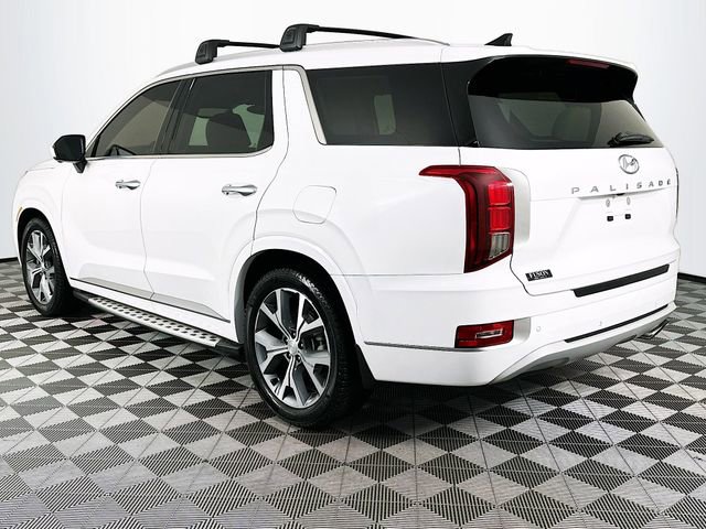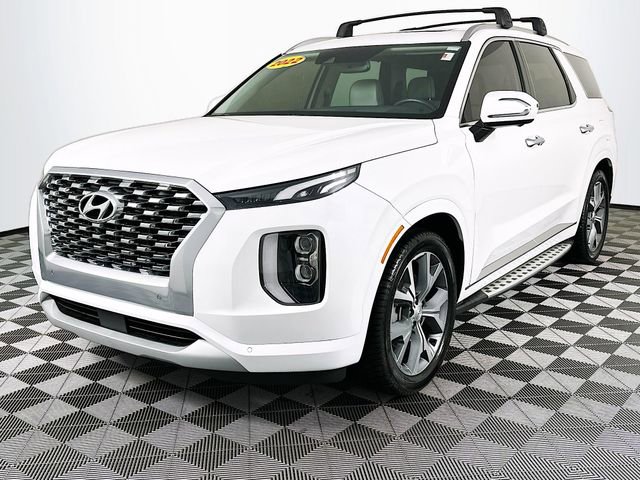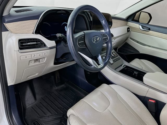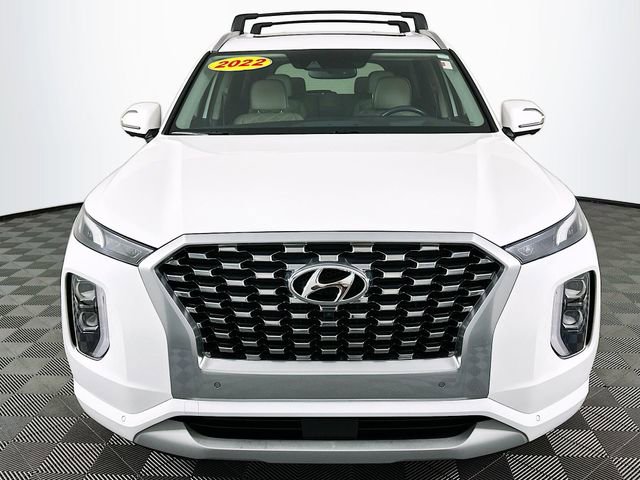 Option Group 01, 12 Speakers, 3.648 Axle Ratio, 3rd row seats: split-bench, 4-Wheel Disc Brakes, ABS brakes, Air Conditioning, Alloy wheels, AM/FM radio: SiriusXM, Apple CarPlay & Android Auto, Auto High-beam Headlights, Auto-dimming Rear-View mirror, Auto-leveling suspension, Automatic temperature control, Brake assist, Bumper Applique, Bumpers: body-color, Cargo Net, Cargo Tray, Carpeted Floor Mats, Compass, Delay-off headlights, Driver door bin, Driver vanity mirror, Dual front impact airbags, Dual front side impact airbags, Electronic Stability Control, Emergency communication system: Blue Link Connected Car Service (3-year complimentary subscription), Four wheel independent suspension, Front anti-roll bar, Front Bucket Seats, Front Center Armrest, Front dual zone A/C, Front reading lights, Fully automatic headlights, Garage door transmitter: HomeLink, harman/kardon® Speakers, Heads-Up Display, Heated & Ventilated Front Bucket Seats, Heated door mirrors, Heated front seats, Heated rear seats, Heated steering wheel, Illuminated entry, Knee airbag, Low tire pressure warning, Memory seat, Mudguards, Navigation System, Occupant sensing airbag, Outside temperature display, Overhead airbag, Overhead console, Panic alarm, Passenger door bin, Passenger vanity mirror, Power door mirrors, Power driver seat, Power Liftgate, Power moonroof, Power passenger seat, Power steering, Power windows, Premium Nappa Leather Seat Trim, Radio data system, Radio: AM/FM/MP3 Premium Audio System, Rain sensing wipers, Rear air conditioning, Rear anti-roll bar, Rear audio controls, Rear reading lights, Rear window defroster, Rear window wiper, Reclining 3rd row seat, Remote keyless entry, Security system, Speed control, Speed-sensing steering, Split folding rear seat, Spoiler, Steering wheel mounted audio controls, Tachometer, Telescoping steering wheel, Tilt steering wheel, Traction control, Trip computer, Turn signal indicator mirrors, Variably intermittent wipers, Ventilated front seats, Ventilated rear seats, and Wheels: 20 x 7.5J Split 5-Spoke Machined Alloy. CARFAX One-Owner. Hyper White Hyundai 2022 Palisade Limited